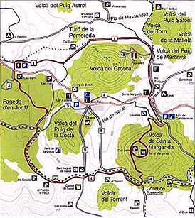 Este itinerario es circular y está pensado para empezarlo y acabarlo en el mismo punto, después de visitar tres de los lugares más conocidos y atractivos del Parque Natural. El inicio recomendado es en el área de Can Serra (hayedo de Jordà), también se puede empezar en el área de Santa Margarita. Las dos áreas se encuentran en la carretera GI-524 de Olot a Santa Pau. Además, a lo largo de su recorrido hay conexiones con los itinerarios 3 (Olot- Can Xel), 4 (Can Xel-Santa Pau), 5 (Can Xel-Colltort) y 15 (gredales del Croscat). Si se sale del Área de Can Serra en dirección Sur, se cruza inmediatamente la carretera y se bajan unas escaleras que dan acceso a la Fageda d'en Jordà. Justo antes, a mano derecha, se encuentra el monolito erigido en memoria del poeta Joan Maragall. La Fageda d'en Jordà La famosa Fageda d'en Jordà es un bosque de hayas excepcional porque crece en un terreno llano, de baja altitud (550 m). De hecho, se asienta encima de una colada de lava que expulsó el volcán del Croscat, la cual ofrece un relieve accidentado, con abundantes prominencias muy características, que pueden alcanzar más de 20 m. de altura y que recibe el nombre local de tossols. Saliendo del hayedo, el camino se eleva hacia el cuello de Can Batlle y San Miquel de Sacot, iglesia de planta románica del siglo XI. De allí baja al llano de Sacot y por el collet de Bassols se sitúa en el flanco sudoeste del volcán de Santa Margarita. El volcán de Santa Margarita Se trata de un volcán mixto, que tiene fases eruptivas de tipo estromboliano y freatomagmático. Estas últimas son explosivas, y la que se produjo en el de Santa Margarida abrió, al explotar, un amplio cráter circular, dentro del que hay una ermita que da el nombre al volcán. A excepción del cráter, que hoy es un prado, el resto del volcán está recubierto de bosques, encinas rn la solana y caducifolios mixtos en la ombría. El itinerario baja ahora hasta el área de Santa Margarita, donde enlaza con el itinerario 4 (Can Xel-Santa Pau), atraviesa la carretera GI-524 y coincide con el itinerario 15 (gredales del Croscat) hasta el desvio de Can Passavent. El volcán del Croscat EL Croscat es un volcán de tipo estromboliano y su cono es el más grande de la península Ibérica, con 160 m de altura. Es también, según parece, el más joven de todos. Durante años sufrió extracciones de materiales volcánicos en su flanco, que han dejado un corte impresionante (gredales) y que pueden visitarse siguiendo el itinerario 15. Después de bordear el antiguo vertedero,