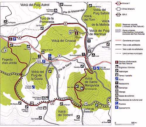 Si se surt de l'Àrea de Can Serra en direcció sud, es creua immediatament la carretera i es baixen unes escales que donen accés a la Fageda d'en Jordà. Just abans, a mà dreta, hi ha el monòlit erigit en memòria del poeta Joan Maragall. La Fageda d'en Jordà La famosa Fageda d'en Jordà és un bosc de faigs excepcional perquè creix en un terreny planer, de baixa altitud (550 m). De fet, s'assenta damunt d'una colada de lava que va emetre el volcà del Croscat, la qual ofereix un relleu accidentat, amb abundoses prominències molt característiques, que poden assolir més de 20 m d'alçada i que reben el nom local de tossols. Sortint de la Fageda, el camí s'enfila cap al coll de can Batlle i Sant Miquel de Sacot, església de planta romànica del segle XI. D'allà baixa al pla de Sacot i pel collet de Bassols se situa al flanc sud-oest del volcà de Santa Margarida. El volcà de Santa Margarida Es tracta d'un volcà mixt, que tingué fases eruptives de tipus estrombolià i freatomagmàtic. Aquestes darreres són explosives, i la que va produir-se al de Santa Margarida va obrir, en esclatar, un ample cràter circular, dins del qual hi ha l'ermita que dóna nom al volcà. Tret del cràter, que és avui un prat, la resta del volcà està recobert de boscos, alzinars a solell i caducifolis mixtos a l'obaga. L'itinerari baixa ara fins a l'Àrea de Santa Margarida, on enllaça amb l'itinerari 4 (Can Xel - Santa Pau), travessa la carretera GI-524 i coincideix amb l'itinerari 15 (grederes del Croscat) fins al trencant de can Passavent. El volcà del Croscat El Croscat és un volcà de tipus estrombolià i el seu con és el més gran de la península Ibèrica, amb 160 m d'alçada. És també, segons sembla, el més jove de tots. Durant anys va patir extraccions de materials volcànics al seu flanc, que han deixat un tall impressionant (grederes), que pot visitar-se seguint l'itinerari 15. Després de vorejar